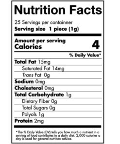 NÄHRWERTANGABEN: Portion/Süßigkeit (1 g). Energie pro 100 g: 1680 kJ/400 kcal; Fett 1,5 g, davon gesättigte Fettsäuren 1,4 g; Kohlenhydrate 97,2 g, davon Zucker 0 g, Polyole 97,2 g; Ballaststoffe 0,9 g; Eiweiß 0,2 g.