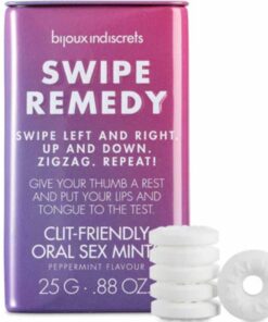 SWIPE REMEDY sind zuckerfreie Mentholbonbons, die speziell für Oralsex entwickelt wurden und mit intensiven Geschmacks- und Temperaturkontrasten begeistern. Menthol sorgt für ein kühlendes Gefühl im Speichel und erzeugt einen aufregenden Kontrast zur Wärme der Vulva. Erleben Sie Oralsex auf einem neuen Level.
