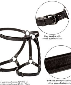 Steigern Sie das Vergnügen mit dem Multi Chain Thigh Harness aus der Euphoria-Kollektion: ein Premium-Accessoire für intensivere Wünsche. Verstellbare Taillen- und Oberschenkelgurte sorgen mit einem einfachen Schnallenverschluss für eine bequeme Passform. Das zeitgemäße Design sorgt für Langlebigkeit und verbessert die Gesamtzufriedenheit. Genießen Sie das luxuriöse Gefühl der weichen Samtinnenseite und den Hauch von Raffinesse der veganen Lederaußenseite. Die robuste Konstruktion mit doppelter Polsterung und Nähten sorgt für Komfort bei leidenschaftlichen Begegnungen. Nicht anlaufende metallische Akzente sorgen für Glamour und sorgen für eine atemberaubende und verlockende Optik. Mit seinem vielseitigen Design passt es in die meisten Standardgrößen. Entfesseln Sie Ihre Wünsche und entdecken Sie neue Ebenen der Aufregung mit dem Collections Multi Chain Oberschenkelgeschirr