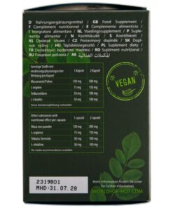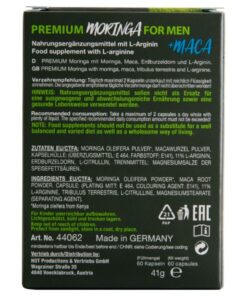 Moringa Oleifera Pulver*, Maca Wurzelpulver, Kapsel: (Plattierungshandschuh: E 464, Farbstoff: E141), 11% L-Arginin, Tribulus Terrestris, L-Citrullin, Magnesiumstearat (Trennmittel).