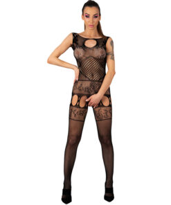 Der Bodystocking Ambroise ist ein Vorschlag für Frauen, die nach der verführerischsten Unterwäsche suchen. Der sexy Overall ist aus flexiblem und transparentem Material gefertigt. Der obere Teil des Bodystockings zieht mit seinen frivolen Ausschnitten die Aufmerksamkeit auf sich, die vorne rund und hinten korsettartig sind. Die zarte Spitze und das Netz begeistern durch ihre Komplexität, sie sind an den Brüsten fast vollständig transparent, bilden dann am Bauch ein Rautenmuster und verlaufen horizontal bis zu den Hüften. Der untere Teil der Unterwäsche ähnelt einem Strumpfgürtel mit Strumpfbändern. Das Netz liegt sinnlich an den Beinen an und imitiert Netzstrümpfe, wodurch Sie den Bodystocking unter einem Kleid tragen können. Niemand außer der Person, die den sexy Overall trägt, wird erraten, welche Schätze sich unter dem Büroanzug verbergen. Erotische Dessous geben jeder Frau das Gefühl, schön und mutig zu sein. Im Schlafzimmer wird es die Figur einer Frau attraktiv betonen, und dank des offenen Schritts muss man den Bodystocking nicht ausziehen, um sein Potenzial voll auszuschöpfen. Ein verspielter Overall aus schwarzem Netz und Spitze ist eine pikante Alternative zu traditioneller Unterwäsche.